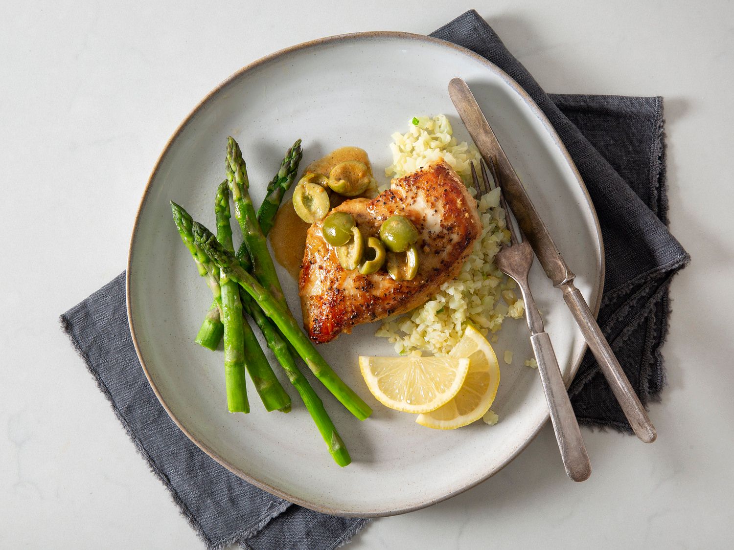 Chicken breasts, butter, chicken broth, heavy cream, lemon, green olives, Olive oil blend, onions, garlic, Fresh and dried herbs and spices, citrus, cauliflower rice, asparagus
