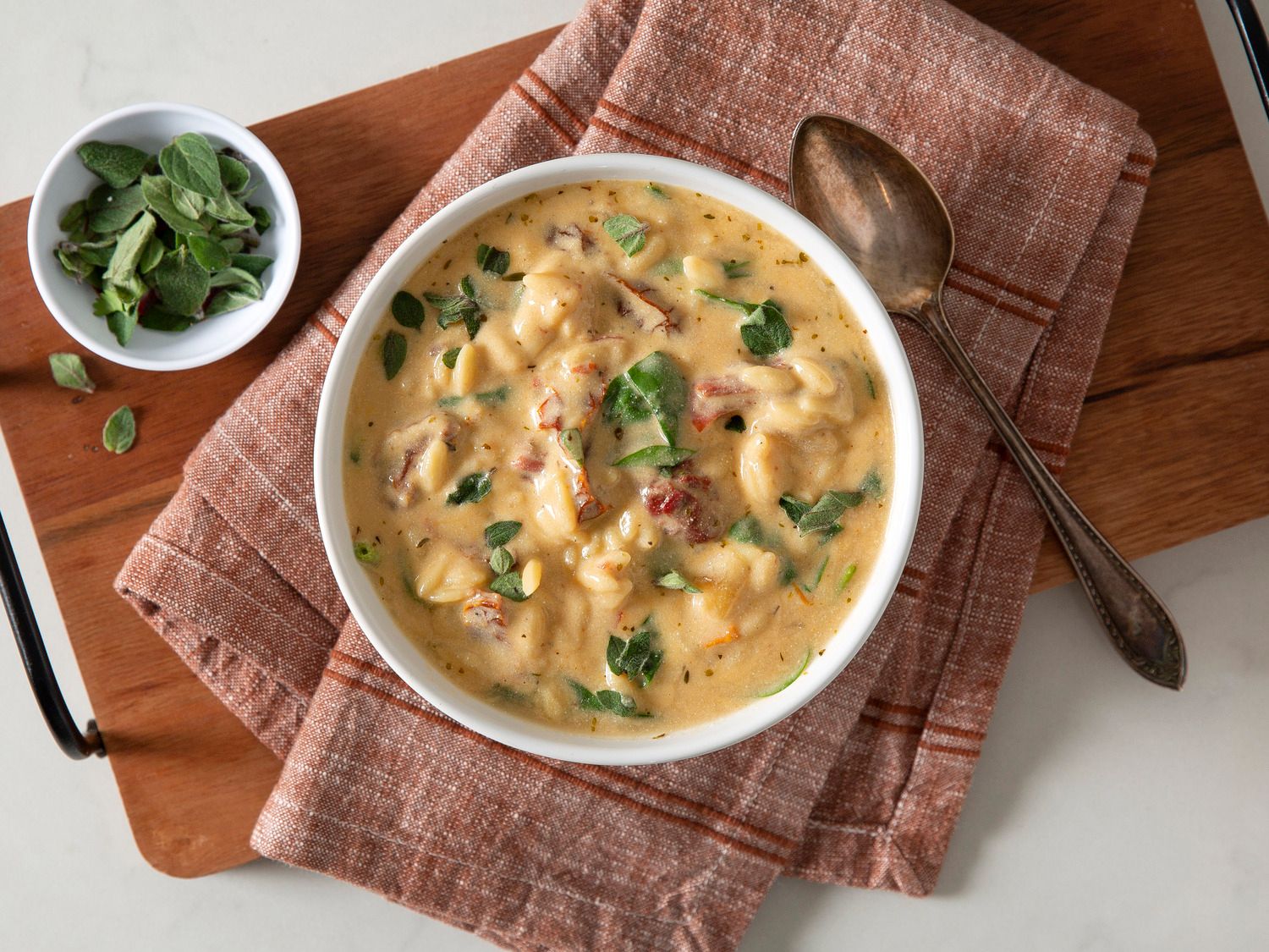 Nutrition Info: 319 calories, 30g fat, 8g carbs, 2g fiber, 8g protein. butter, flour, Italian seasoning, crushed red pepper, vegetable broth, milk, cheese tortellini, sun-dried tomatoes, ricotta cheese, Parmesan cheese, spinach, Olive oil blend, onions, garlic, Fresh and dried herbs and spices, citrus